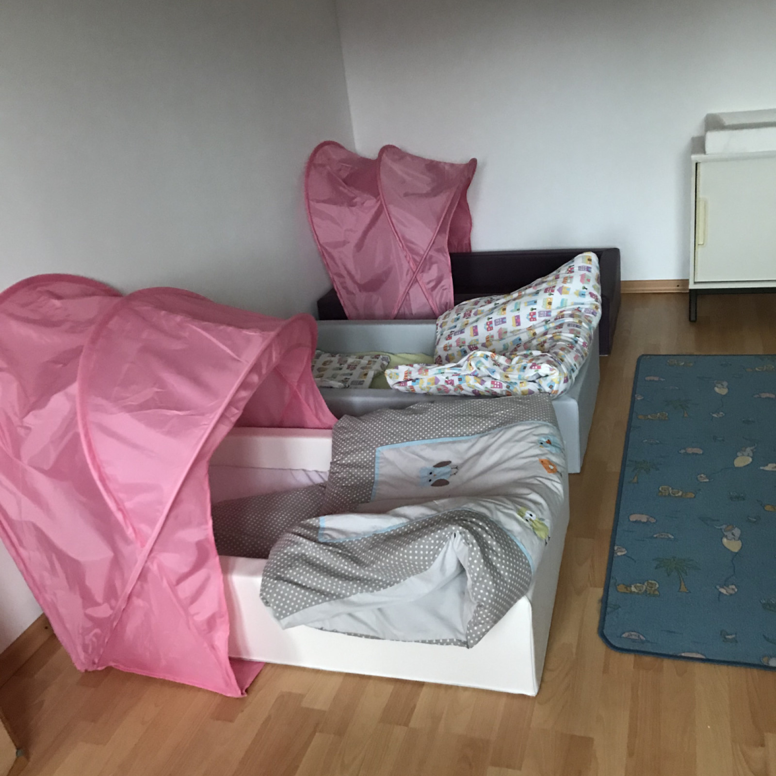 Für den Mittagsschlaf oder um sich auszuruhen gibt es den Schlafbereich mit einem eigenen Bett für jedes Kind.